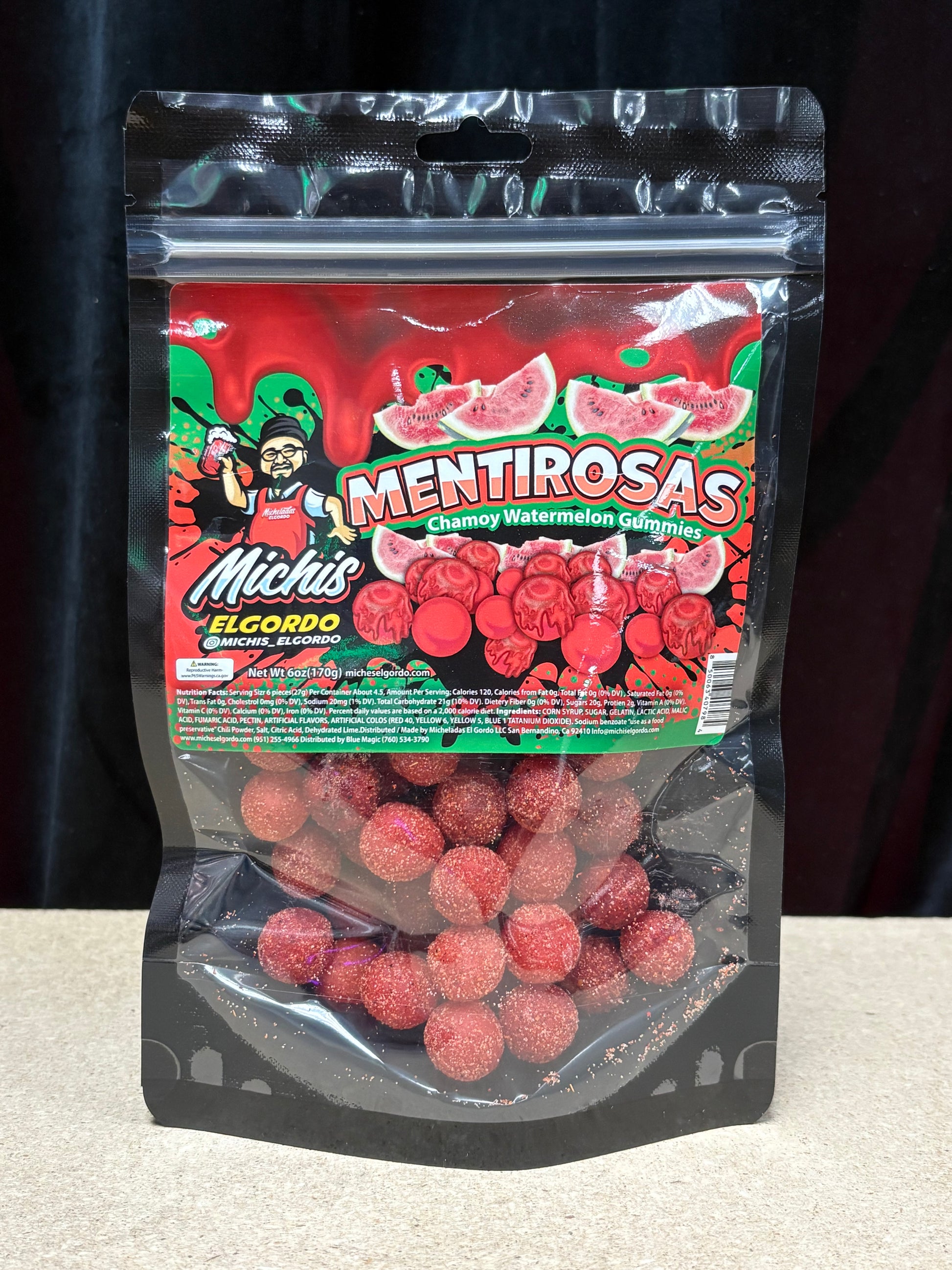 Watermelon sour balls covered in El Gordo's special blend of spices.